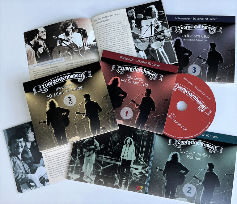 In seinem Buch "Volkes Lied und Vater Staat | Die DDR-Folkszene 1976-1990" schreibt der Autor Wolfgang Leyn, dass womöglich die Folkszene der einzige Bereich war, in dem es eine deutsch-deutsche Vereinigung auf Augenhöhe gab. Denn die Folkszene der DDR, die parallel zur westdeutschen Mitte der 70er Jahre entstand, wurde - anders als in der Ökonomie und der Politik* - nicht übernommen. Zumal die "Folkies" aus Ost und West auf eine gewisse Art und Weise schon eins waren, sich längst kannten über die Grenzen hinaus. Ob nun indirekt über das Hören von Schallplatten oder ganz direkt von Liveauftritten bei diversen Liederfestivals, bei denen dann oftmals auch das Duo "Zupfgeigenhansel" mit auf der Bühne stand. Anlässlich ihres 50-jährigen Plattenjubiläums haben Erich Schmeckenbecher und Thomas Friz in Eigenregie ein aufwändiges 3er-CD-Album zusammengestellt. Diese Werkschau enthält alle relevanten Lieder ihrer Karriere. Siehe auch: Liedermacher – Folk – Volkslieder