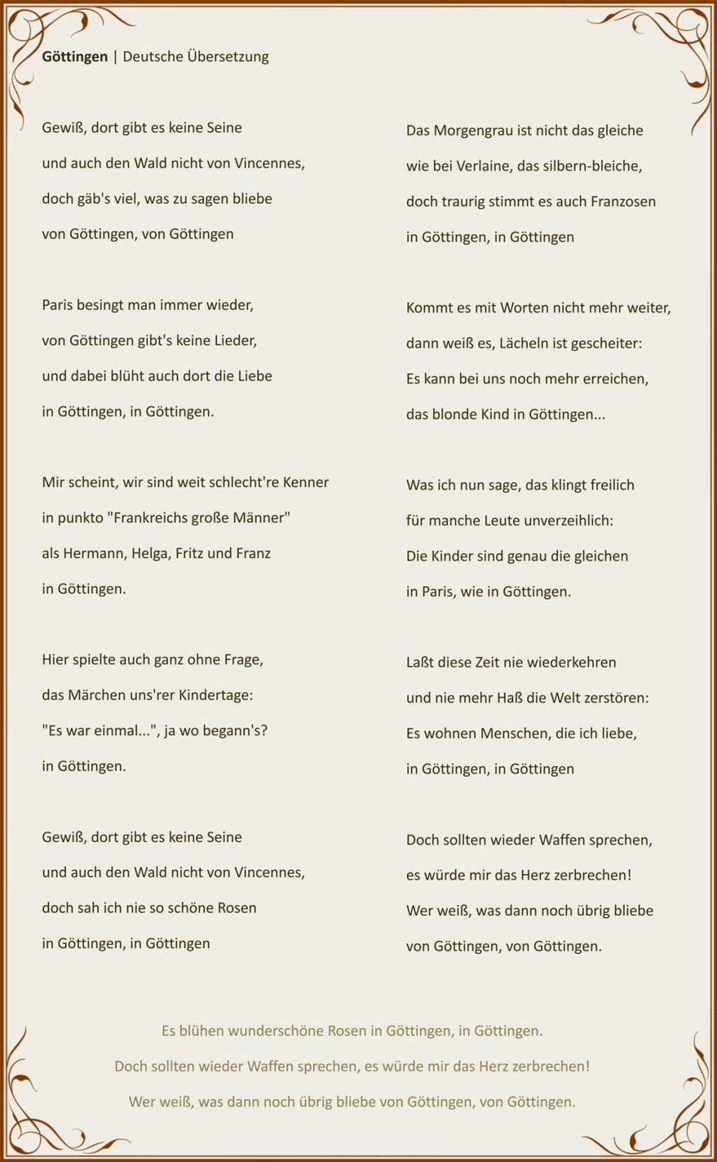 "In und über Göttingen hat eine meiner Lieblingssängerinnen ein Lied über die deutsch-französische Freundschaft verfasst." Zitat: Hélène Bigot Über diese Frau und ihr Lied wollte ich mehr erfahren. Bei meiner Recherche wurde ich schnell fündig: