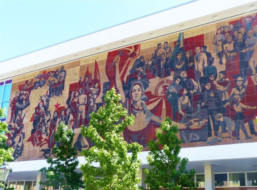 Nomen est omen, wurde es mit einer strapazierfähigen Technologie von Farbglas auf Betonplatten versehen, die das „Sozialismus-Modell DDR“ problemlos überdauerte. Es zeichnet nach meiner Meinung die Kulturstadt Dresden aus, dass dieses Wandbild, eine Arbeit der Hochschule der Bildenden Künste Dresden aus dem Jahr 1969, nicht auf dem Scheiterhaufen einer bigotten politischen Korrektheit entsorgt wurde.