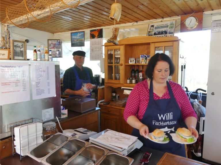 Für authentische Fischgerichte auf Hiddensee empfiehlt der in Stralsund beheimatete Schifffahrts-Journalist Peer Schmidt-Walter die Fischbarkasse "Willi". Sie ist etwas abseits von der Anlegestelle der weißen Flotte an einem Landungssteg im Hafen von Kloster fest gemacht. Es haben sich eine Menge Kunden eingefunden und der alte Fischer Hubert Türke hilft beim Verkauf mit aus. Er gehört zu den Fischerfamilien der Insel, die seit Generationen in der Ostsee mit Fischkuttern auf Fischfang gehen.