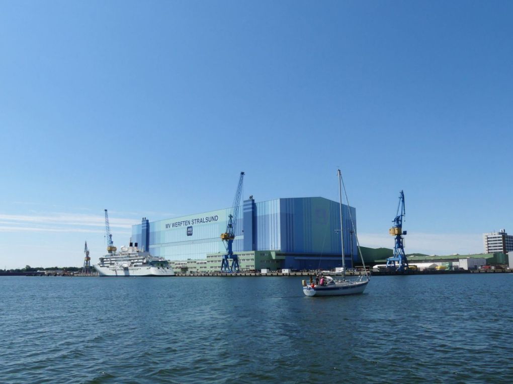 Die Rundfahrt führt auch exklusiv an den riesigen Schiffsbau-Montagehallen der ehemaligen Volkswerft vorbei, heute MV- Werften der asiatischen Genting-Group. Vor 20 Jahren wurde der Umbau zu einer der modernsten Kompaktwerften abgeschlossen. In der Nachbarschaft befindet sich der Seehafen Stralsund, in dem jährlich über eine Million Tonnen Güter umgeschlagen werden. Die Nachfrage der Kreuzfahrtbranche rund um die Stralsunder Region ist ebenfalls gewachsen. Auch seegängige Kreuzfahrtschiffe bis zu 10.000 Bruttoregister fuhren in den vergangenen Jahren in den Sund zwischen Rügen und dem vorpommerschen Festland.