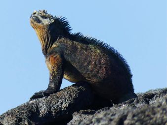 Bei den Big 15 haben die Echsen einen großen Stellenwert. Insgesamt drei Arten wurden in den erlesenen Kreis aufgenommen. Zunächst der grüne Leguan, der faktisch auf nahezu allen Inseln auftritt, dann der sandgelbe Santa-Fé Leguan, der wie es sein Name signalisiert, nur auf der kleinen Galapagos-Insel Santa Fé vorkommt und schließlich der Meeres-Leguan. Diese Meer-Echse hat sich vom Land- zum Meeresbewohner entwickelt, tritt massenhaft in Erscheinung und ist sogar in den Häfen von Galapagos unterwegs.