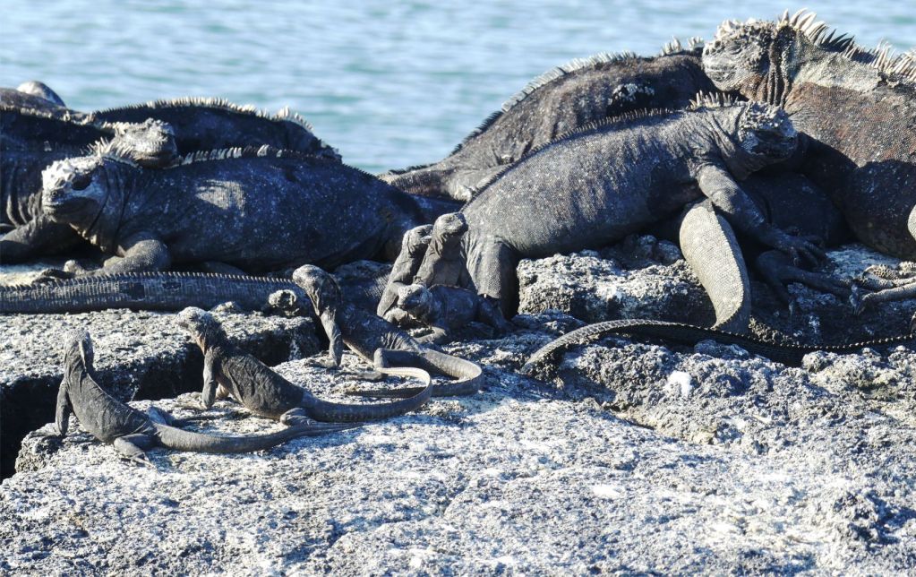 Bei den Big 15 haben die Echsen einen großen Stellenwert. Insgesamt drei Arten wurden in den erlesenen Kreis aufgenommen. Zunächst der grüne Leguan, der faktisch auf nahezu allen Inseln auftritt, dann der sandgelbe Santa-Fé Leguan, der wie es sein Name signalisiert, nur auf der kleinen Galapagos-Insel Santa Fé vorkommt und schließlich der Meeres-Leguan. Diese Meer-Echse hat sich vom Land- zum Meeresbewohner entwickelt, tritt massenhaft in Erscheinung und ist sogar in den Häfen von Galapagos unterwegs.