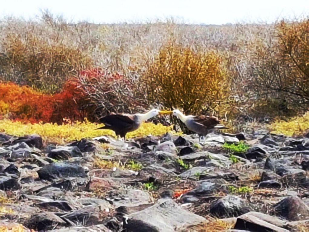 Es gibt derzeit knapp zwei Dutzend Arten. Aber nur eine Art ist in den Tropen auf Galapagos zu Hause und hier nur auf der Vulkaninsel Espanola zu finden. Ein ausführlicher Rundgang auf der Insel - auf schmalen mit kleinen Felssteinen begrenzten Touristenpfaden - führt an einer bunten Vielfalt an Tieren vorbei, beginnend bei Seelöwen, Massen von Darwin-Finken und Tölpel-Vögeln sowie Unmengen von bunt gefleckten Meerechsen. Der Tourist muss ständig auf den Boden schauen, die Echsen rücken auf dem schmalen Pfand keinen Millimeter zur Seite und machen nicht Platz. Dann findet der Besucher schließlich in den Herbsttagen auch eine Möglichkeit, einige der Albatros-Paare zu beobachten, die auf der Insel leben. Denn nach Schätzungen brüten hier mehr als 10.000 Paare in der Zeit von April bis Anfang Dezember. Im Unterschied zu den anderen Arten fliegen die Galapagos-Albatrosse nicht über die Weltmeere, sondern bleiben in ihrem Insel-Revier oder vor den Küsten von Ecuador und Peru. Im September und Oktober haben Besucher die Chance, ihre legendären Balztänze zu sehen.