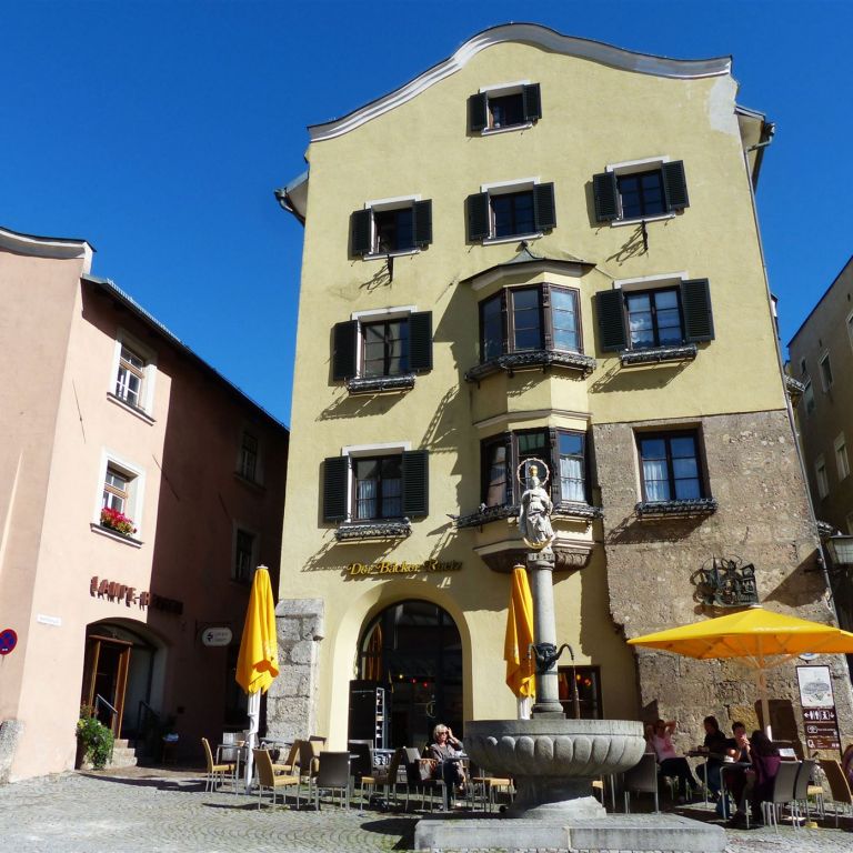 Der Mittelpunkt der Stadt ist der Obere Stadtplatz mit der dominierenden Pfarrkirche und dem unscheinbaren Rathaus. Vor den mittelalterlichen Hausfassaden haben sich zur warmen Jahreszeit Cafes und Restaurants mit Tischen, Stühlen und bunten Sonnenschirmen ausgebreitet. Hinter Häuserwänden in einer Ecke des Platzes versteckt, residiert hinter einem schmalen Toreingang der traditionsreiche „Goldene Löwe“. Das erste Speise-Reistaurant am Platze lässt es sich nicht nehmen, neben den edlen Österreich-Spezialitäten wie Tafelspitz oder Wiener Kalbsschnitzel auch ganz Uriges aus Tirol anzubieten. Dazu gehört: