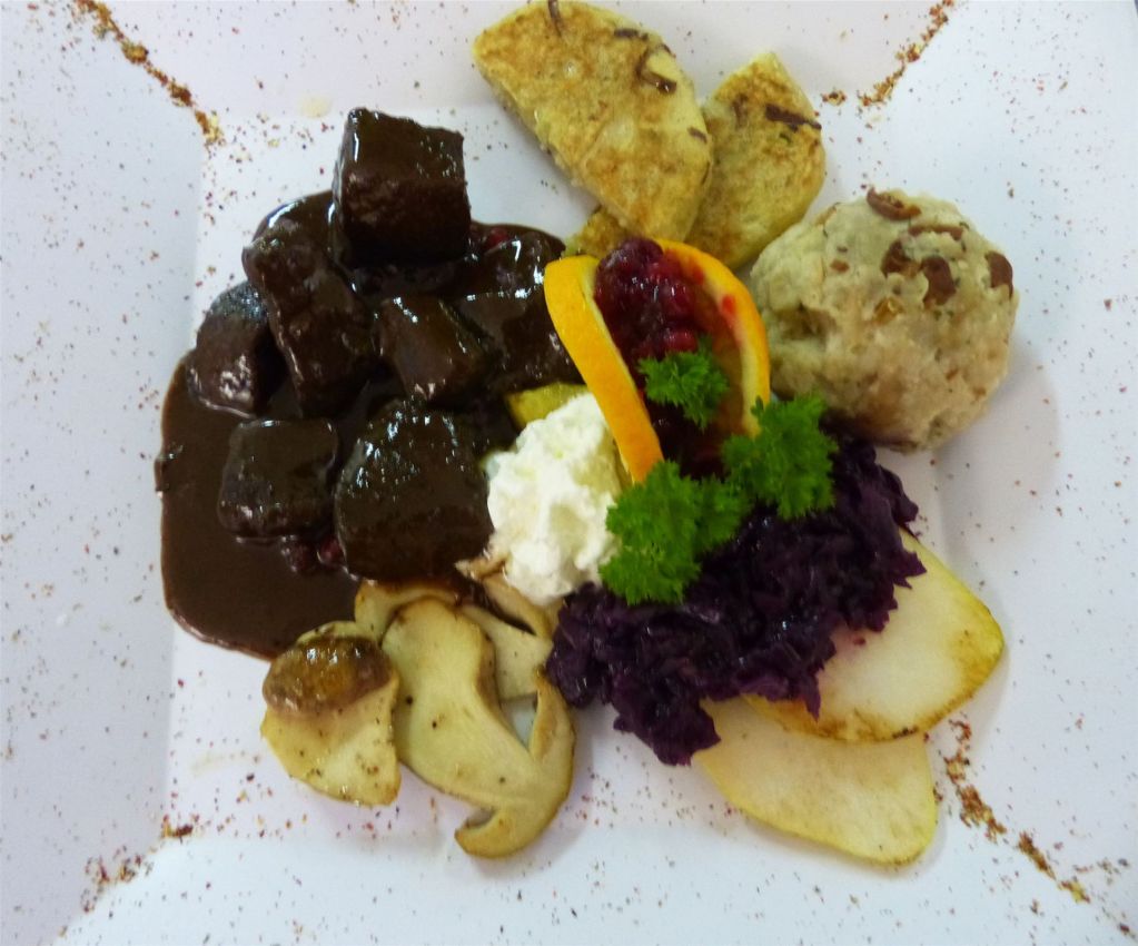 Hirsch-Ragout mit a bisserl Rotkraut und Johannisbeeren, einem Pfifferling-Knödel, ein paar Spazerln und Polenta.