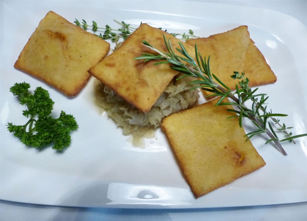 (Die Polenta aus Maisgries ist in Tirol auch ein traditionelles Nahrungsmittel. Die Polenta wird von Sonja mit Milch statt Wasser angemacht und zusätzlich im Ofen leicht überbacken)