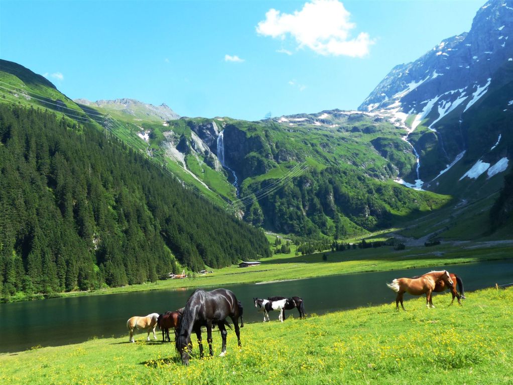 Ein schmaler Wanderweg um den See führt an einer Pferdekoppel auf einer bunten Wiese vorbei. Hier hat Bergwanderführerin Elisabeth seit zwei Jahren für Urlauber ein Mental-Training mit Pferden eingerichtet unter dem Titel: “Wir sind Pferdemenschen“, um ein besonderes Erlebnis mit Pferden zu schaffen. Auch ein Ziel für geführte Wandertouren für Touristen aus dem Sporthotel Kogler.