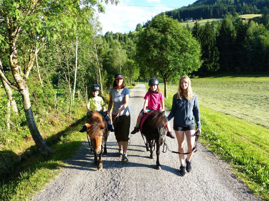An diesem Nachmittag im Juni ist Ihre Schwester Andrea Kogler, die sich vornehmlich der Kinderbetreuung der Gäste annimmt, wie so oft mit ihren Ponys Berry und Thomy unterwegs. Auf dem Rücken der Ponys haben sich auf den bequemen Ledersätteln die fünfjährige Anna und der dreijährige Lucas platziert. Sie müssen sich nur festhalten und werden von Andrea und einer Helferin aus dem Reitstall ein Stück des Rundwanderweges geführt.