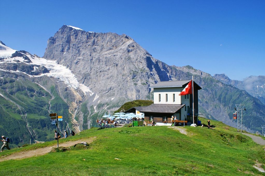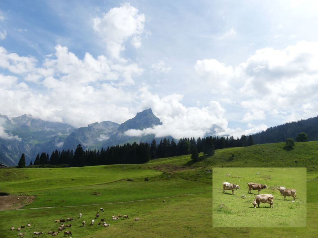 Die Terrasse ist an einer Seite durch eine Bergkulisse begrenzt. Der Blick zur anderen Seite ist auf Alpwiesen gerichtet, von denen das Geläut von Kuhglocken bis an die Tische und Bänke des Restaurants herüber reicht.