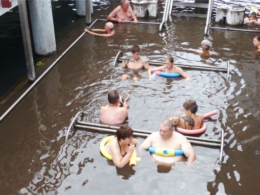 Es ist schon ein besonderes Gefühl, von den imposanten Bauten im Badehaus-Stil, die mit Holzstegen verbunden sind, in das Thermalwasser des Sees zu steigen und sich treiben dann zu lassen. Während sich früher die Badegäste dazu in Schwimmringe aus Holz zwängten, helfen heute dabei schmale aufgeblasene Gummiringe so genannte "Schwimm-Nudeln". Sie werden um Kopf und Rumpf geschlungen und halten die Badenden ohne Schwimmbewegungen bequem über Wasser.